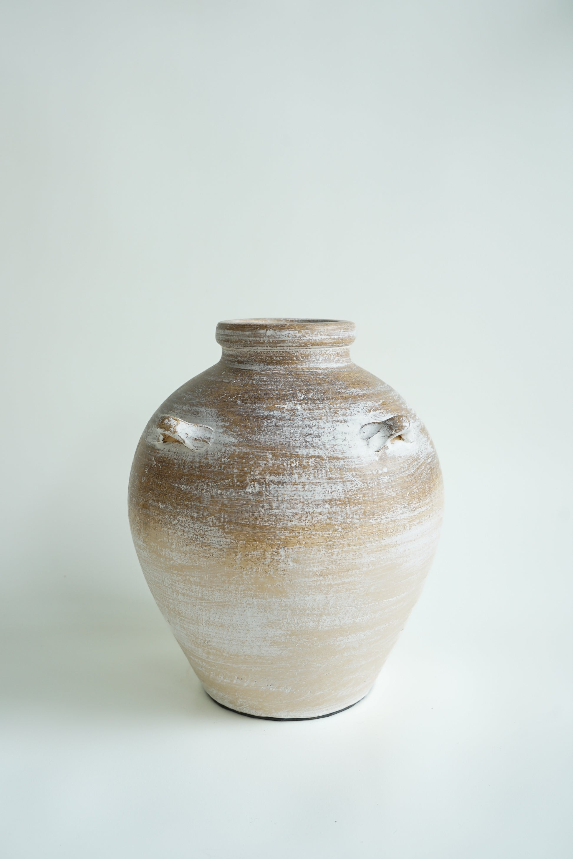 De afwerking bestaat uit warme, aardse bruintinten die speels worden doorbroken door een lichte, krijtachtige white‑wash. Dit geeft de vaas een doorleefde, licht verweerde uitstraling. De matte textuur voelt zacht en natuurlijk aan, waardoor het oppervlak extra karakter krijgt.